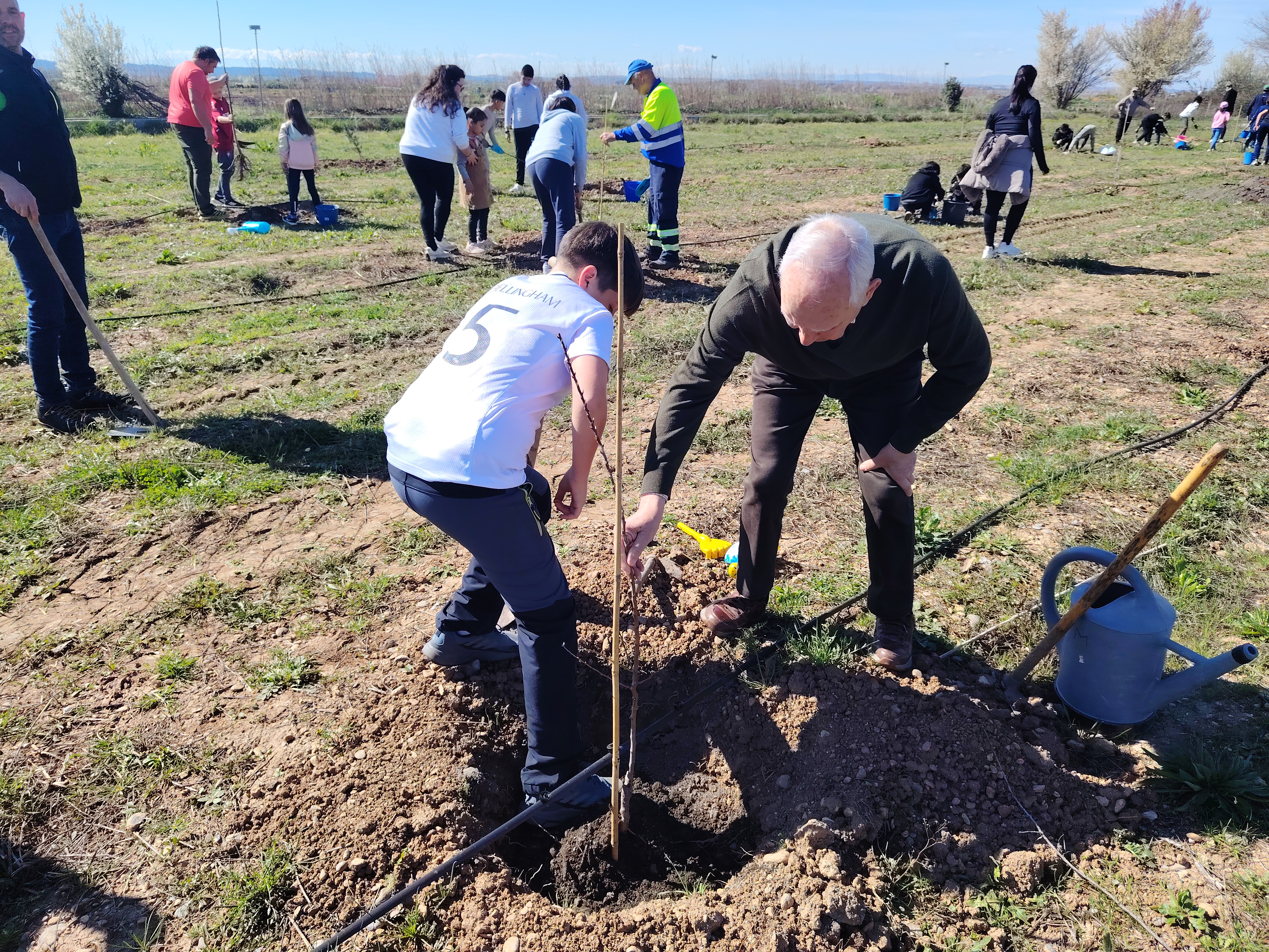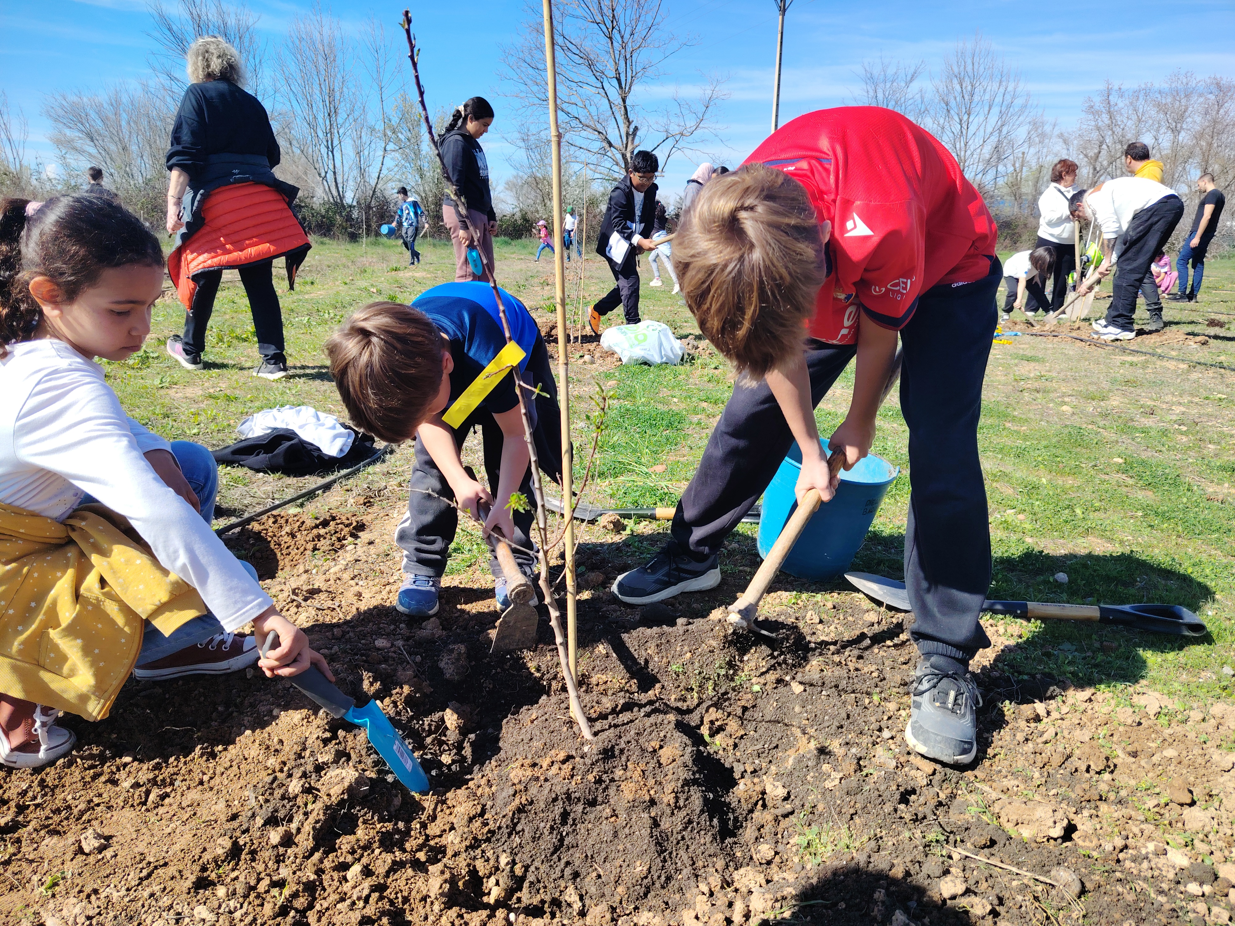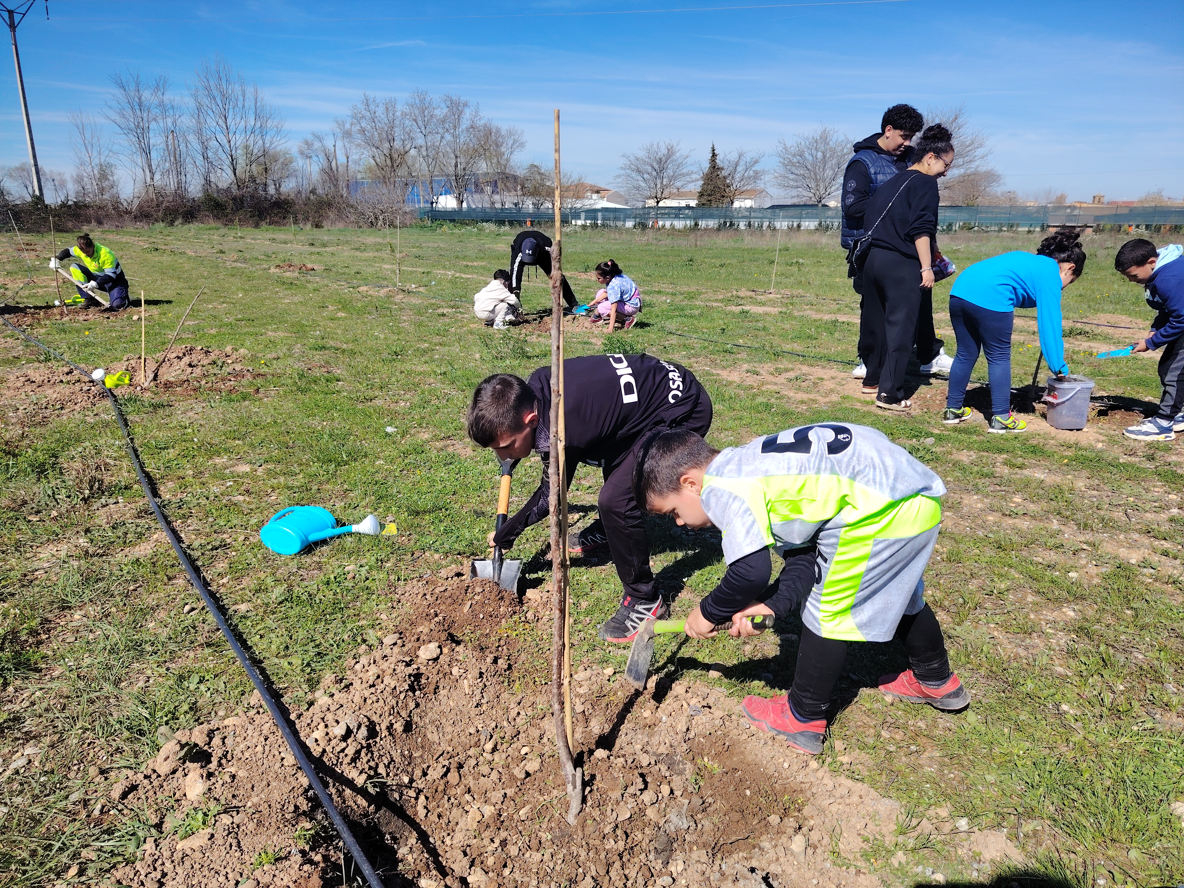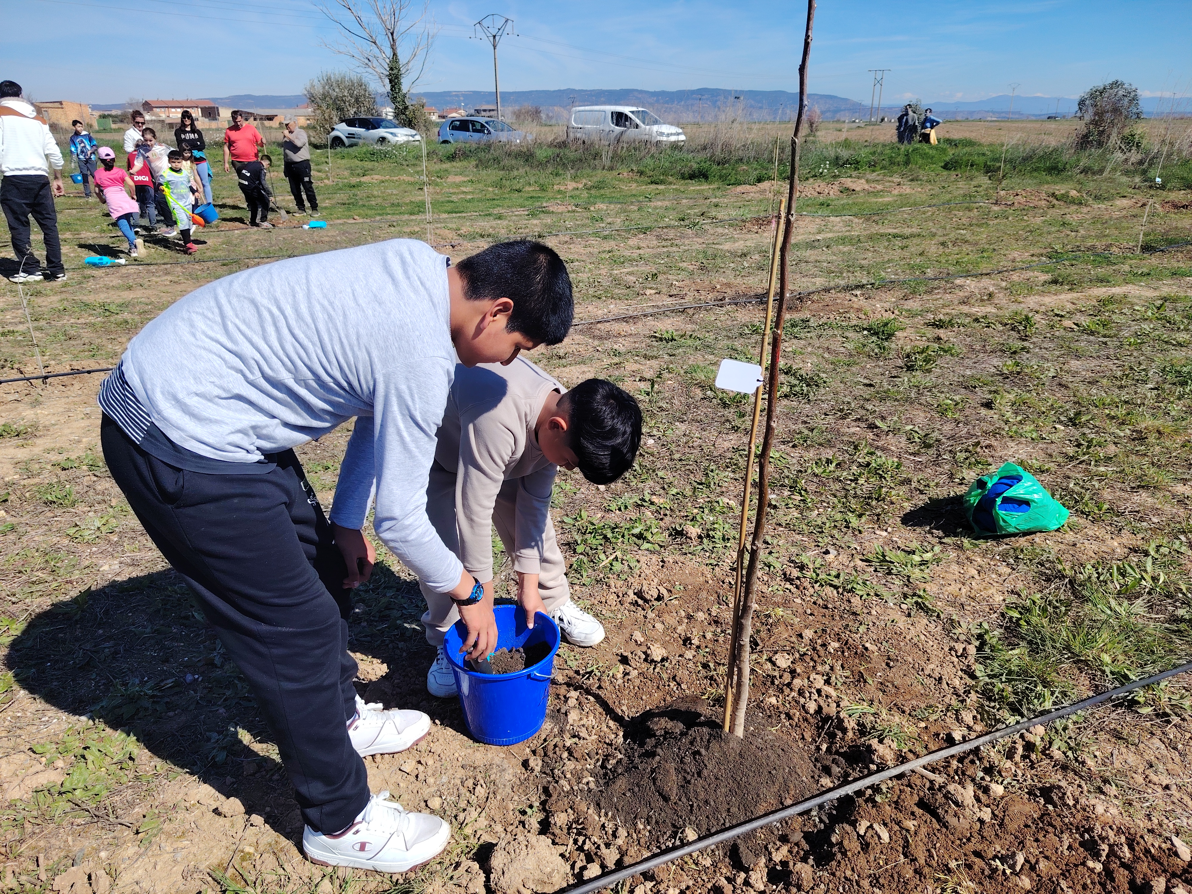 El pasado viernes celebramos en nuestro cole el "Día del árbol". Con la ayuda de familiares y miembros del Ayuntamiento plantamos diferentes tipos de árboles: cerezos, almendros y nogales. El Ayuntamiento nos había dejado preparados los hoyos donde colocar cada árbol y con nuestras palas y rastrillos los rellenamos de tierra y sustrato. Al finalizar, colocamos etiquetas identificativas.