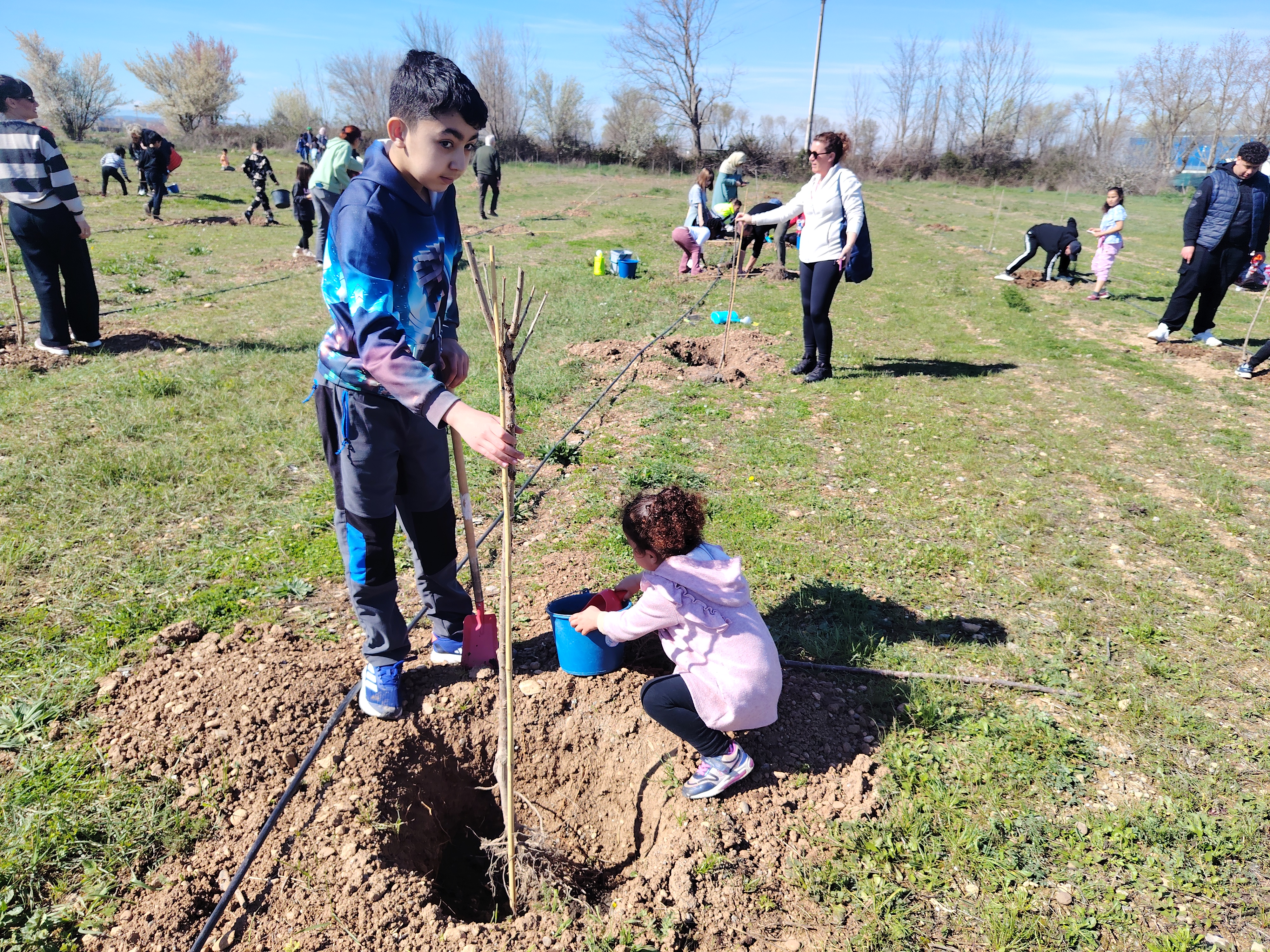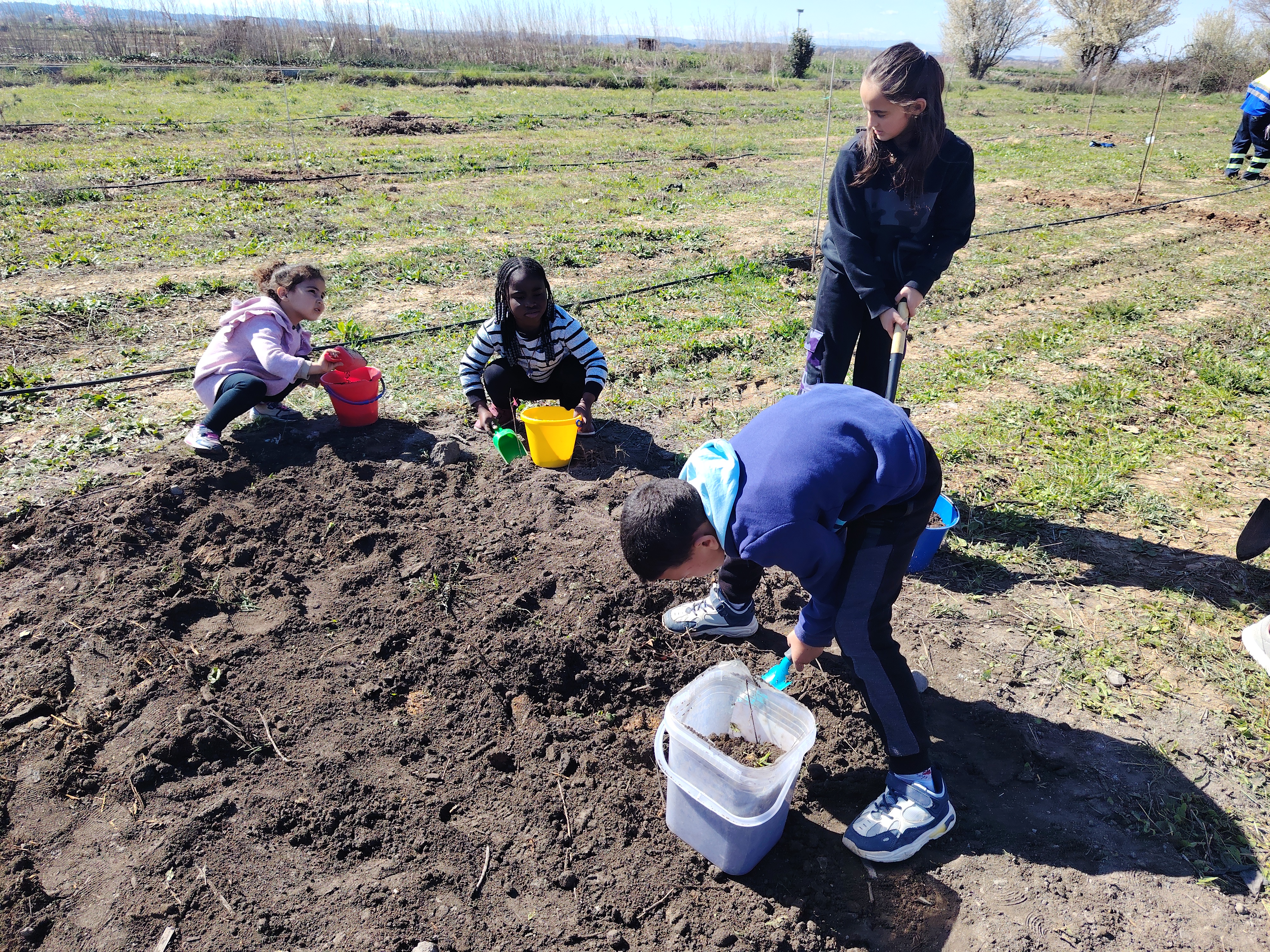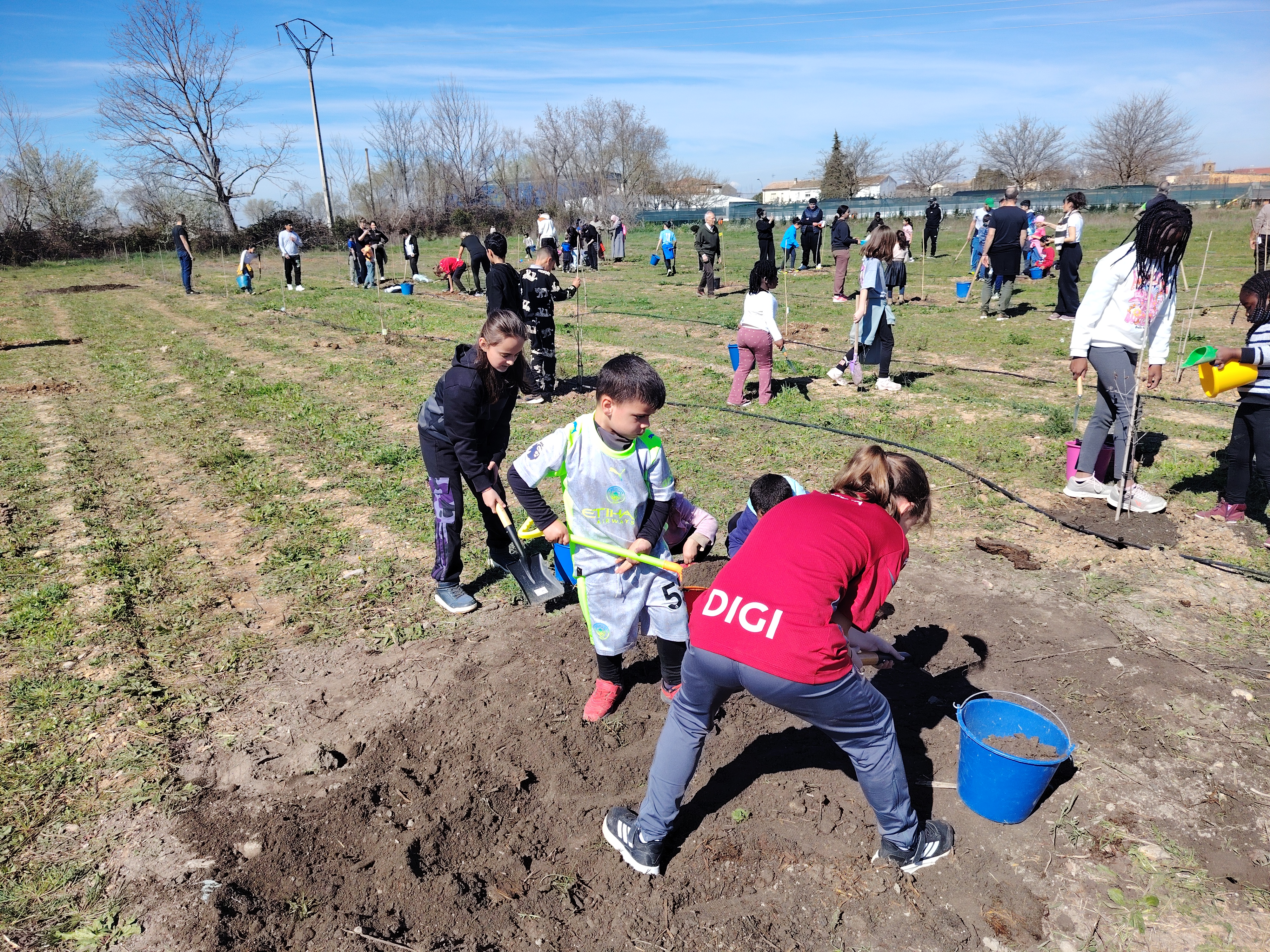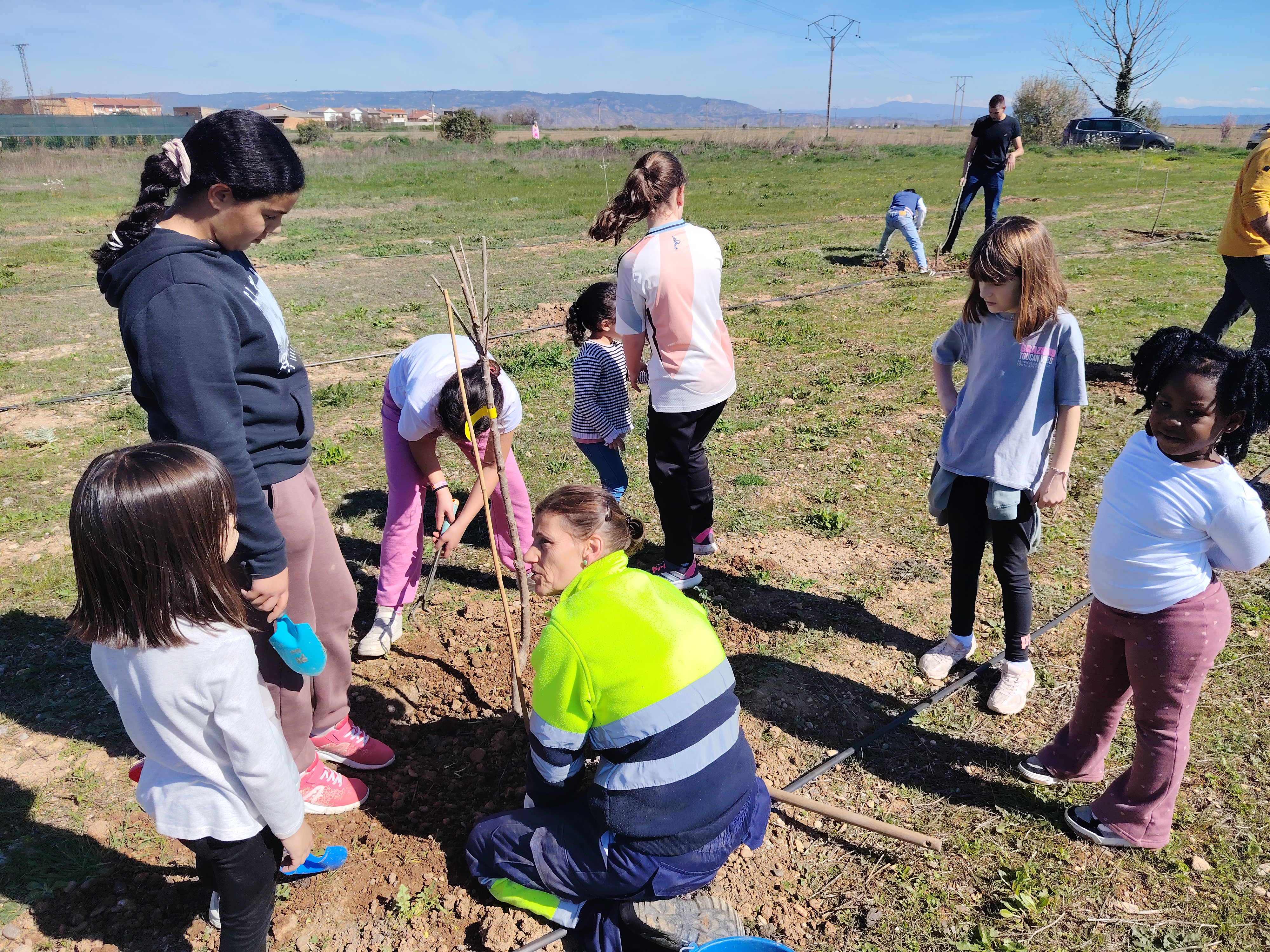 El pasado viernes celebramos en nuestro cole el "Día del árbol". Con la ayuda de familiares y miembros del Ayuntamiento plantamos diferentes tipos de árboles: cerezos, almendros y nogales. El Ayuntamiento nos había dejado preparados los hoyos donde colocar cada árbol y con nuestras palas y rastrillos los rellenamos de tierra y sustrato. Al finalizar, colocamos etiquetas identificativas.
